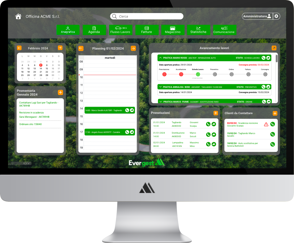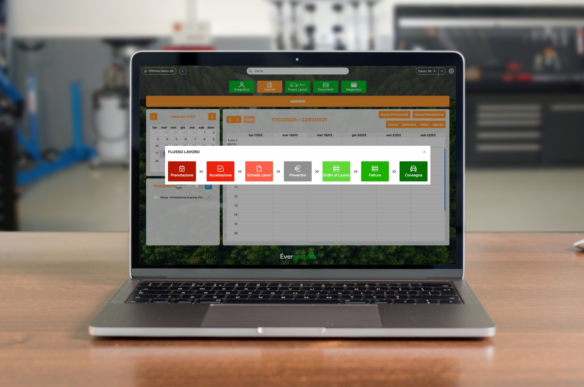 Evergest è completamente personalizzabile per soddisfare le esigenze di ogni Officina. Puoi modificare la disposizione dei widget, lo sfondo e i colori, creando una soluzione su misura per te.